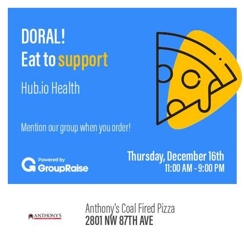 On Thursday, December 16th, from 11:00 AM - 9:00 PM, Anthony's Coal Fired Pizza at 2801 NW 87TH AVE is donating back % of sales from Dine-in, Takeout & Pick up orders to Hub.io Health!